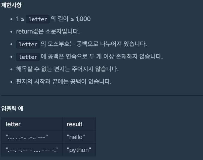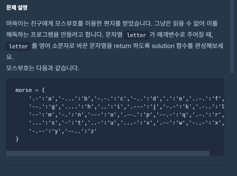 솔직히 모스부호 첨부터 hashmap으로 줘도 되는거아닌가.. 아니면 부호만 따로 배열로 주던가 ㅠㅠ